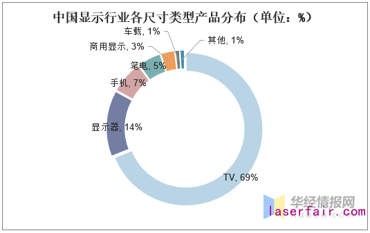激光顯示技術成本與(yu) 屏幕尺寸關(guan) 聯度相對較低,所以在大尺寸上更具優(you) 勢。從(cong) 我國商用顯示行業(ye) 各尺寸類型產(chan) 品分布來看,TV占比69%,位居行業(ye) 第一。