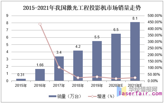 在激光工程投影機市場,據統計,截至2019年我國激光工程投影機市場銷量為(wei) 5.5萬(wan) 台,同比增長30.95%,預計2021年我國激光工程投影機市場銷量為(wei) 8.1萬(wan) 台。