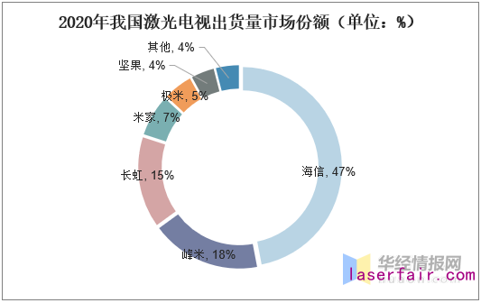 競爭(zheng) 格局方麵,目前,海信憑借廣泛的產(chan) 品布局、完善的銷售渠道以及適宜的定價(jia) 策略,在激光電視市場中獨占鼇頭,據統計,2020年海信以激光電視出貨量市場份額47%位居第一,排第二的峰米,激光電視出貨量占比18%,其次是長虹、米家、極米與(yu) 堅果,激光電視出貨量分別占比15%、7%、5%與(yu) 4%,其他品牌激光電視出貨量占比4%。