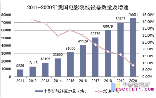 根據國家電影專(zhuan) 資辦發布的《2020年度中國電影市場數據報告》數據顯示,2020年,中國電影總票房達到204.17億(yi) 元,因疫情影響比上年減少68.23%,但首次票房位居全球市場第一,其中2020年新增銀幕5794塊,全國銀幕總數達到75581塊。