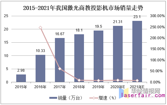 在激光教育投影機市場,據統計,截至2019年我國激光商教投影機市場銷量為(wei) 19.5萬(wan) 台,同比增長7.7%,預計2021年銷量為(wei) 23.1萬(wan) 台。