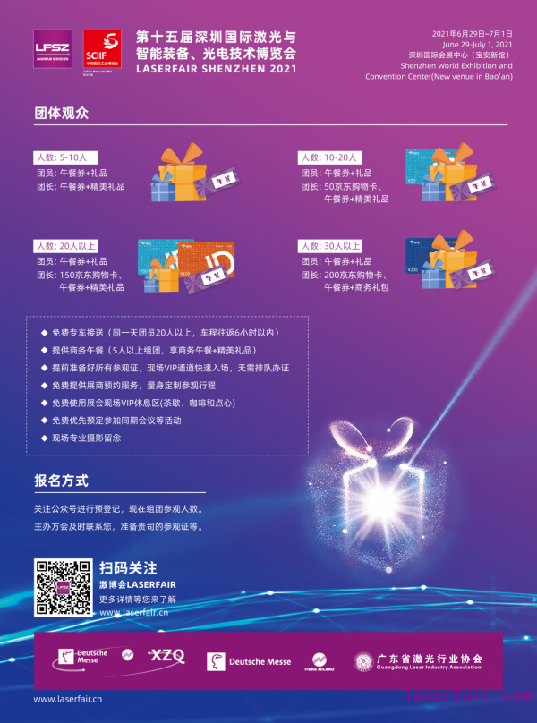 您還在等什麽(me) ?專(zhuan) 車、專(zhuan) 人,尊享9重禮遇,現在就報名加入第十五屆深圳國際激光與(yu) 智能裝備、光電技術博覽會(hui) 參觀團吧!省時省力,高效觀展,這一份邀請函您值得擁有!
