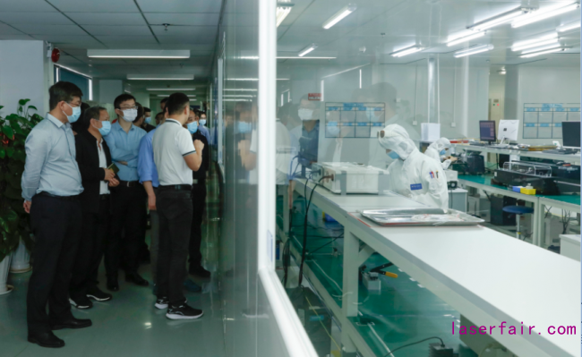 調研組領導一行都十分關(guan) 心創鑫激光核心競爭(zheng) 力和國產(chan) 化技術水平。隨後,胡總帶調研組參觀了公司器件生產(chan) 車間和激光器產(chan) 品組裝車間,現場講解了激光器從(cong) 器件生產(chan) 到成品測試生產(chan) 全流程。
