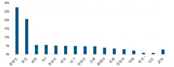 工程投影市場需求比較零散,市場領導者不僅(jin) 要有完善的產(chan) 品布局,還要有廣闊的銷售網絡來覆蓋更多的地理區域和應用行業(ye) 。今年1季度,日係品牌愛普生和索尼以出貨量計排名前兩(liang) 位,兩(liang) 個(ge) 品牌的主要出貨量均來自5000-5900流明段的產(chan) 品。迪恒在類工程機和6000-6900流明段產(chan) 品都有不錯的表現,推高其出貨量,排名第三。總體(ti) 來看,在第二集團內(nei) ,迪恒、NEC、索諾克、鬆下、視美樂(le) 、光峰等的市占均在5%左右,競爭(zheng) 相當充分和激烈。