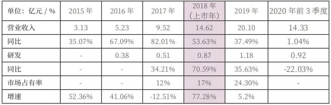 3) 在 財 務 上, 公 司 2018 年、2019 年、2020 年前 3 季度的營業(ye) 收入分別為(wei) 14.62 億(yi) 元、20.10 億(yi) 元、14.33 億(yi) 元,2020 主要是受疫情影響嚴(yan) 重,但該公司依然實現了盈利增長,2018 年、2019 年則實現了非常高速的增長,預計公司在疫情恢複之後,得益於(yu) 募投項目的進行將繼續保持快速增長趨勢。