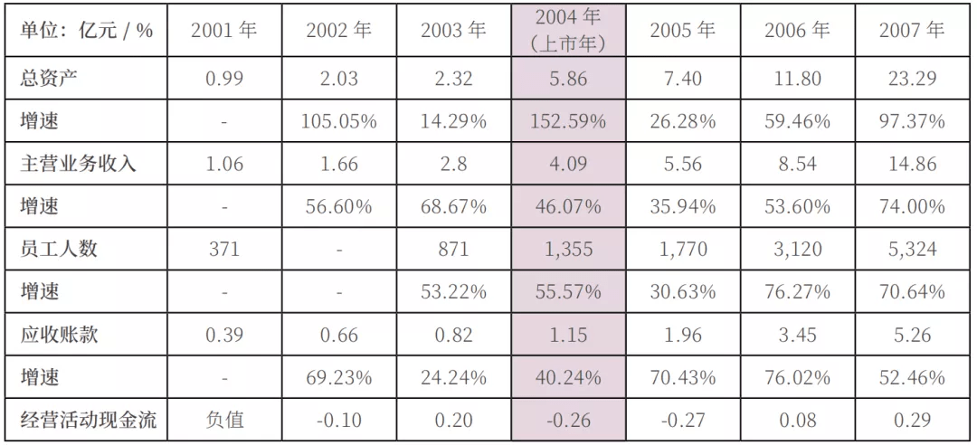 由表 1 可以看出,在上市前 3 年公司的總資產(chan) 、主營業(ye) 務收入、員工人數都保持著非常快速的增幅,2001-2003 年的總增幅分別為(wei) 135%、165%、175%。但 是, 應 收 賬 款 從(cong) 2001 年 的0.39 億(yi) 元增加至 2003 年的 0.82 億(yi) 元,總增幅為(wei) 104%。而且,2001 年、2002 年經營活動產(chan) 生的現金流量淨額為(wei) 負。