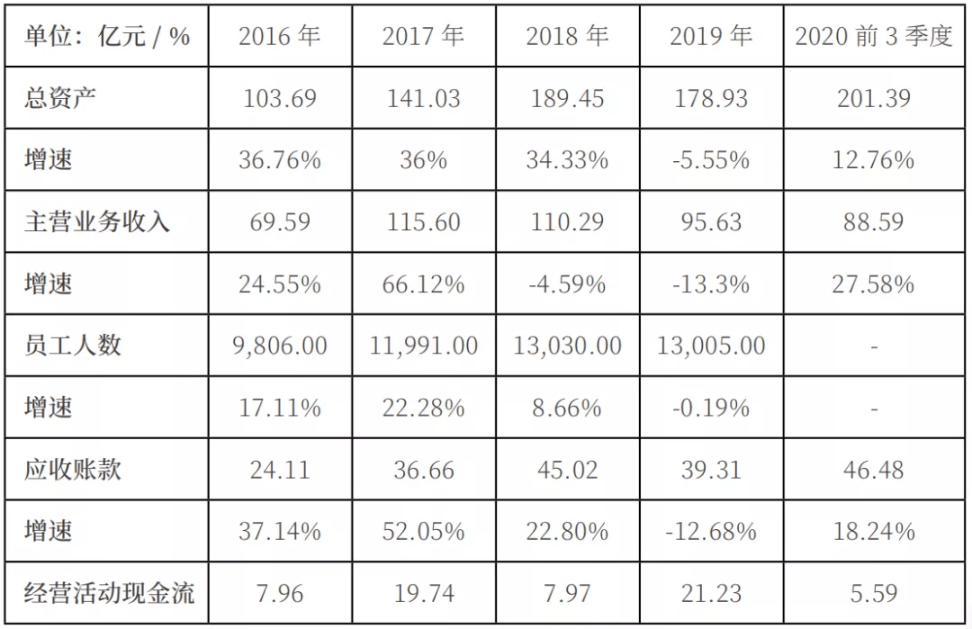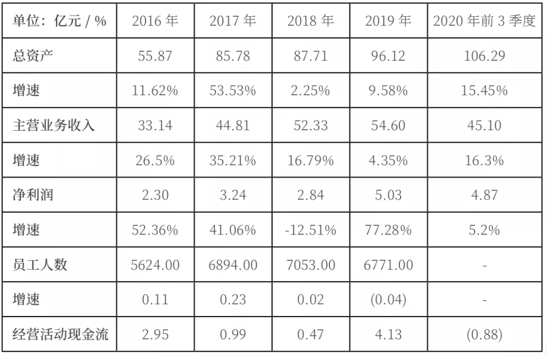 由表 3 可以發現,公司近幾年業(ye) 績快速發展,2016-2019 年主營業(ye) 務收入年均複合增速為(wei) 18%,2019 年疫情對該行業(ye) 形成強大衝(chong) 擊,但公司業(ye) 績依然保持了 4.35% 的增速,2020 年三季度又實現快速反彈,足以說明公司業(ye) 績發展強勁。同時可以發現 2019 年淨利潤反而大幅提升,公司成本控製能力較強。公司在規模上整體(ti) 保持比較快速的發展,2016-2019 年年均複合增速為(wei) 20%,員工人數目前比較穩定。