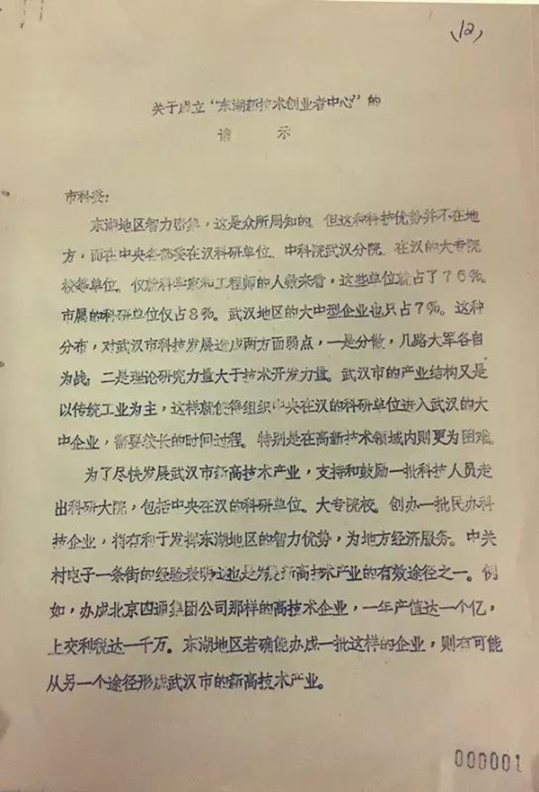 1987年,為(wei) 了給科技創業(ye) 撐起“保護傘(san) ”,尚在籌備階段的東(dong) 湖新技術開發區向武漢市科委遞交了一份關(guan) 於(yu) 成立“東(dong) 湖新技術創業(ye) 者中心”的請示報告。