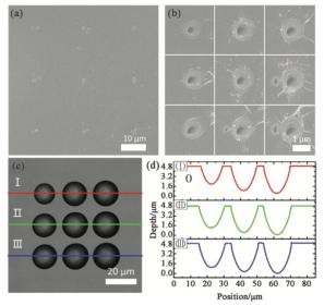 在未移動樣品位置和未改變總的激光脈衝(chong) 能量的前提下,單次單脈衝(chong) 直接曝光即可在石英表麵得到3×3的微燒蝕坑陣列,其形貌如圖 3(a)和(b)的SEM圖所示,驗證了使用這種全息調製的方式可以僅(jin) 通過單次曝光即可實現多個(ge) 不同點的並行燒蝕。當經過20%的HF溶液刻蝕樣品40 min以後,9個(ge) 燒蝕的微坑都具有圓形表麵輪廓,其直徑也隨著燒蝕能量的增加而增加(圖 3(c))。沿圓的直徑提取其截麵數據,定量分析其結構尺寸與(yu) 燒蝕能量之間的關(guan) 係,證明了利用全息光場調製技術僅(jin) 通過控製不同焦點位置的能量即可以實現對微透鏡尺寸的控製,從(cong) 而實現不同尺寸的石英微透鏡陣列的並行加工。