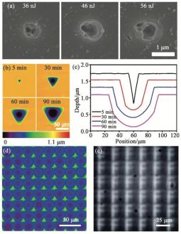 這裏采用的是C相藍寶石,使用不同單脈衝(chong) 能量直接燒蝕得到的結果如圖 7(a)所示。利用該高溫化學反應,單脈衝(chong) 能量為(wei) 36 nJ燒蝕後的藍寶石結構隨刻蝕時間的演化過程如圖 7(b)所示。當在溶液中刻蝕5 min以後,藍寶石表麵的燒蝕微坑已經擴大並演變成倒三棱錐結構,並且隨著刻蝕時間增加。藍寶石表麵微結構的整體(ti) 尺寸也逐漸增加,但是從(cong) 側(ce) 麵圖 7(c)可以看到,在整個(ge) 刻蝕過程中,其斜邊的傾(qing) 斜角度保持不變,但是底部由原來的三棱錐形狀變成了球形。並且隨著刻蝕時間的近一步增加,其底麵的尺寸也隨之變大。經驗證,該底部結構具有比較完美的球麵輪廓。根據這一現象,利用光場調製技術將焦點調製為(wei) 4×4的點陣,焦點之間的間隔略小於(yu) 刻蝕後藍寶石底部的球麵直徑,可以避免由不同晶向引起的三棱柱側(ce) 邊,從(cong) 而實現具有高表麵質量的藍寶石微透鏡陣列結構。圖 7(d)是利用飛秒激光空間光場調製和濕法刻蝕製備的大麵積藍寶石微透鏡陣列結構,可以看到其尺寸分布比較均勻,且都具有比較好的成像效果(圖 7(e))。