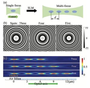 為(wei) 了實現直徑和深度可控的微透鏡陣列的高效製備,如圖 4(a)所示,將經物鏡聚焦的單個(ge) 焦點調製成沿光軸的多個(ge) 焦點,通過調整焦點個(ge) 數來對燒蝕改性深度進行控製,最終實現對微透鏡尺寸的控製。在加工過程中使用的物鏡數值孔徑為(wei) 0.7,其在石英內(nei) 部聚焦的縱向焦深接近3 μm,因此將焦點之間的距離d固定為(wei) 3 μm。當使用略高於(yu) 材料損傷(shang) 閾值的能量進行加工時,焦點與(yu) 焦點之間的距離在刻蝕後仍可以連在一起,從(cong) 而實現對刻蝕後得到微透鏡深度的控製。利用ORA全息算法計算得到的縱向多焦點全息圖如圖 4(b)所示。使用矢量衍射積分算法分別計算了不同全息下物鏡焦點附近光場能量密度分布情況,其結果如圖4(c)所示。為(wei) 了避免空間光調製器中未調製的光斑對加工造成影響,在ORA計算得到的全息圖中疊加了菲涅爾透鏡相位,從(cong) 而將調製和未調製的光場沿光軸方向分離開。
