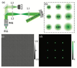 為(wei) 了提高加工效率以及激光能量利用率,這裏使用德國HOLOEYE反射式的液晶相位調製器(LETO-VIS-009)作為(wei) 空間光場調製的手段。基於(yu) LC-SLM的並行飛秒激光加工係統如圖 2(a)所示,波長為(wei) 514 nm,脈寬為(wei) 230 fs的飛秒激光經過LC-SLM進行空間光場調製後,利用4f光路將調製之後的光場相位分布投影到物鏡入瞳,經過物鏡之後,在物鏡焦平麵形成多個(ge) 焦點,實現多點並行加工。為(wei) 了提高飛秒激光的能量利用率,4f係統使用了焦距分別為(wei) 400 mm和300 mm的透鏡,可以在投影的同時實現縮束效果,從(cong) 而在充分利用物鏡數值孔徑的基礎上充分利用飛秒激光的能量。為(wei) 了實現對多個(ge) 焦點的位置和能量的準確控製,並考慮到計算的速度等問題,這裏使用基於(yu) 傅裏葉全息的最優(you) 旋轉角算法(Optimal Rotation Angle Algorithm, ORA),其優(you) 勢在於(yu) 僅(jin) 通過正向傅裏葉變換即可迭代得到較為(wei) 理想的全息相位分布,且隻需要較少的迭代次數。圖 2(b)是預先設計的3×3共計9個(ge) 不同聚焦光點的能量和位置示意圖,其中點與(yu) 點之間的間隔為(wei) 20 μm,其相對能量數值從(cong) 0.6均勻變化到1。利用ORA全息算法計算得到其相應的全息相位分布如圖 2(c)所示,其中最大和最小數值分別對應於(yu) -π和+π。隨後利用S-FFT衍射積分算法對計算得到的全息相位進行光場仿真,並得到其在焦平麵的光場能量分布(圖 2(d)),計算結果與(yu) 設計基本保持一致,證明ORA算法可以滿足並行加工的需求。