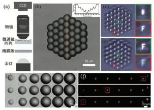 通過ORA算法計算得到相應的全息圖,並利用激光單次曝光燒蝕和濕法刻蝕直接得到呈六方排列的微透鏡陣列。如圖 6(b)所示,經過40 min刻蝕即可得到填充因子為(wei) 100%的微透鏡陣列,且不同位置的微透鏡結構均勻。隨後我們(men) 利用如圖 6(a)所示的測試係統對該三維微凹透鏡陣列的三維成像效果進行分析,其結果如圖 6(c)和(d)所示,其中紅色為(wei) 最外圈微凹透鏡的成像效果,綠色為(wei) 中心微凹透鏡的成像效果。此外,利用縱向焦點個(ge) 數調製的方式,結合樣品台與(yu) SLM動態聯動,對不同位置使用不同焦點個(ge) 數的全息來實現不同尺寸微透鏡陣列的高效製備,其理論最大加工速度可達60個(ge) /s。製備得到的不同尺寸微凹透鏡陣列的頂視圖如圖 6(e)所示,在不改變激光脈衝(chong) 能量的情況下,在相同樣品表麵可以實現不同尺寸的微透鏡陣列。由於(yu) 不同尺寸的微凹透鏡具有相同的擬合半徑和焦距,但是其底部距離表麵的位置不一樣,因此具有不同焦平麵,即該微凹透鏡陣列具有三維的成像能力。如圖 6(f)所示,不同微透鏡陣列都可以具有比較好的成像效果,且隨著微透鏡數值孔徑的增加,“F”的清晰度隨之增加。