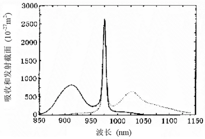 圖1:Yb光纖的吸收截麵(實線)和發射截麵(虛線)