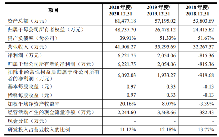 財務數據顯示,公司2018年、2019年、2020年營收分別為(wei) 3.23億(yi) 元、3.53億(yi) 元、4.19億(yi) 元;同期對應的淨利潤分別為(wei) -815.36萬(wan) 元、2,054.06萬(wan) 元、6,221.75萬(wan) 元。