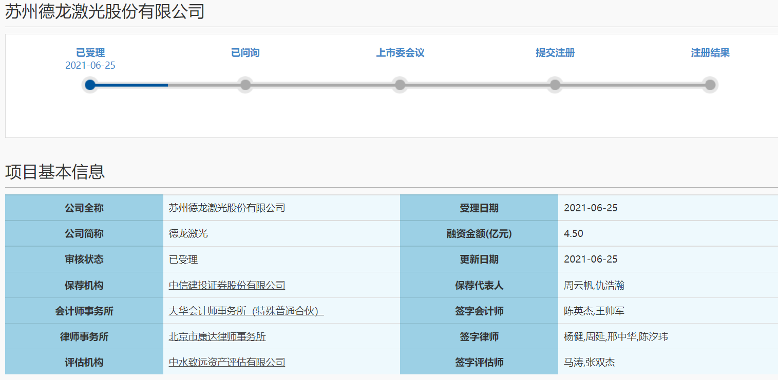 近日,資本邦了解到,蘇州德龍激光股份有限公司(下稱“德龍激光”)闖關(guan) 科創板IPO獲上交所受理,本次擬募資4.5億(yi) 元。