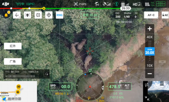 500米外,無人機通過高倍變焦畫麵開展監測(圖源:北移亞(ya) 洲象監測組-李仁培、羅家全、李靖宇、柏兵)