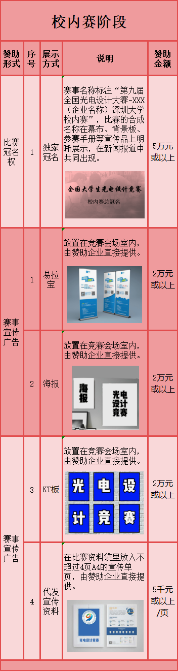 & 根據國競委關(guan) 於(yu) 讚助事項的相關(guan) 規定,以上所有讚助形式均可標注“第九屆全國大學生光電設計競賽”字樣,可以呈現讚助單位LOGO和名稱,為(wei) 體(ti) 現公益性和社會(hui) 性,不可出現“讚助”、“資助”等體(ti) 現商業(ye) 性色彩的字樣,可以有“支持”類的字樣。