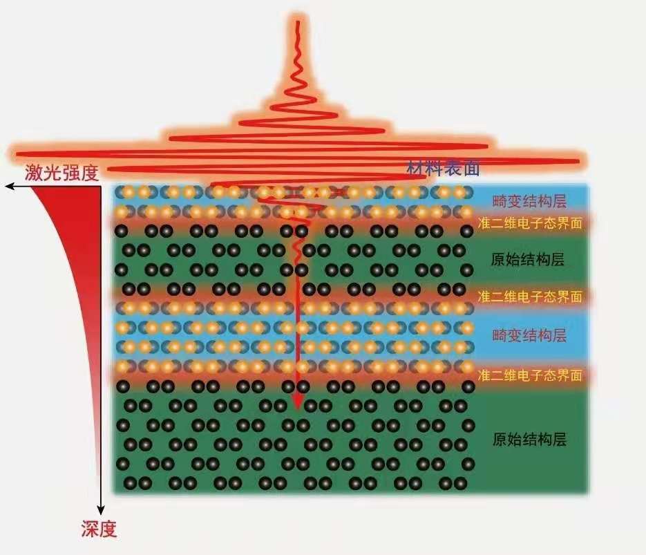 這些二維電子態通常通過機械剝離、人工異質結、分子束外延生長等方法製造人工結構來實現。此次的研究提出並實現了在量子材料中利用超快激光調控產(chan) 生二維電子態的新方法。該方法利用在特定激光強度下激發相幹電子—聲子相互作用所引起的材料晶格宏觀周期性畸變,結合激光在材料中由於(yu) 穿透深度引起的強度分布,從(cong) 而導致這種晶格畸變在材料中分層出現並在晶格畸變層與(yu) 原始層之間實現了一種長程有序的二維電子態。