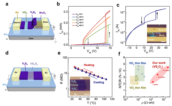 (d) 激光直寫(xie) V5S8-VSxOy-V5S8異質結NTCR器件示意圖;