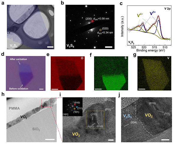 (h,i) V5S8和VO2的拉曼光譜圖以及VO2的變溫拉曼測試譜圖。