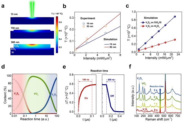 近日,清華大學材料學院劉鍇課題組利用激光按預設路徑局部輻照加熱氧化超薄硫化釩,便捷地在常壓大氣環境中實現了VO2的秒級圖案化合成,顯著區別於(yu) 傳(chuan) 統VO2合成方法真空、長時間、全局加熱、圖案化工藝複雜的缺點。通過有限元模擬、反應動力學分析與(yu) 實驗研究,該工作證明了VO2的成功合成可以歸因於(yu) 激光超快輻照下動力學限製的合成機製和V5S8厚度依賴的光熱效應。具體(ti) 來說,V5S8的氧化是從(cong) 低價(jia) 到高價(jia) (V5S8→VSxOy→VO2→V3O7, V2O5)的分步過程。由於(yu) 激光輻照可以實現百納秒級的數百攝氏度的超快升降溫,控製激光輻照時間便可以實現超短的化學反應時間,從(cong) 而得到了V5S8的亞(ya) 穩相氧化物VO2。在相同激光輻照時間下,樣品溫度會(hui) 隨V5S8厚度和激光功率增大而升高,化學反應速率加快從(cong) 而得到高價(jia) 態的釩氧化物。由此該工作在實驗上得到了V5S8厚度和激光功率依賴的氧化產(chan) 物相圖,從(cong) 而實現了VO2的可控合成。