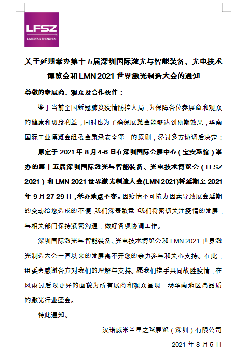 原定於(yu) 2021年8月4-6日在深圳國際會(hui) 展中心(寶安新館)舉(ju) 辦的第十五屆深圳國際激光與(yu) 智能裝備、光電技術博覽會(hui) (LFSZ 2021)和LMN 2021世界激光製造大會(hui) (LMN 2021)將延期至2021年9月27-29日,舉(ju) 辦地點不變。因疫情不可抗力因素導致展會(hui) 延期的變動給您造成的不便,我們(men) 深表歉意!我們(men) 將密切關(guan) 注疫情的發展,與(yu) 相關(guan) 部門保持緊密溝通,做好各項協調工作。