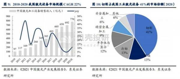 從(cong) 終端市場來看,切割、焊接和打標仍為(wei) 我國工業(ye) 激光設備的主要應用場景,2020年切割占據我國工業(ye) 激光設備41%的市場份額,是名副其實的第一大應用領域,半導體(ti) 與(yu) 顯示、精密金屬加工和非金屬加工等新興(xing) 領域正在加速放量。