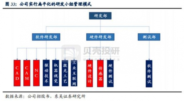 對於(yu) 底層技術儲(chu) 備,公司實行扁平化的研發架構管理模式,設有CAD、CAM、NC、傳(chuan) 感器、硬件設計、機器視覺、激光工藝、驅動技術和工業(ye) 互聯網等能力小組,各能力小組專(zhuan) 注於(yu) 專(zhuan) 項技術開發,以研究成果和技術方案為(wei) 產(chan) 出,公司不設定嚴(yan) 格的時間和經濟指標,這有助於(yu) 提升公司底層技術的研發深度和效率。