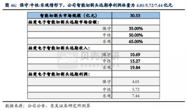 類比激光切割控製係統業(ye) 務,我們(men) 也對公司遠期智能切割頭利潤空間進行了測算:在35%、50%、65%三種遠期市占率(銷售額)情形條件下,公司遠期智能切割頭收入體(ti) 量可達10.69、15.27和19.84億(yi) 元,假定穩定後淨利率35-40%,中樞37.5%,在保守、中性、樂(le) 觀三種情形下,智能切割頭業(ye) 務遠期淨利潤體(ti) 量分別為(wei) 4.01億(yi) 、5.72億(yi) 和7.44億(yi) 元。(東(dong) 吳證券)