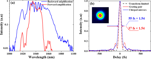 實驗裝置如圖1所示,振蕩器及預放大後的小信號光先經過偏振分束器及旋光器等器件後,以水平偏振注入棒狀光纖進行第一通放大,再由後麵的旋光器和反射鏡返回並旋轉至豎直偏振後再次注入棒狀光纖進行第二通放大,預啁啾光柵對放置在兩(liang) 通放大之間,雙通放大後的輸出光分為(wei) 主輸出和次輸出,絕大部分激光從(cong) 主輸出口輸出並被光柵對壓縮。科研人員將預啁啾管理放大技術與(yu) 雙通放大技術相結合,利用雙通放大的高增益特性允許將振蕩器輸出的數十毫瓦弱小信號直接放大到百瓦量級的特點,簡化了實驗裝置,並通過優(you) 化裝置參數,在負啁啾下得到了兼具高平均功率和極短脈寬的結果。圖2藍色曲線是利用6片啁啾鏡得到的壓縮結果,對應脈寬55fs, 平均功率100W。該研究成果揭示出雙通預啁啾管理放大係統中非線性相移量影響功率輸出的本質特性,並提供了一種結構緊湊、具有高增益的超快光纖激光係統建造方法。進一步結合分脈衝(chong) 放大技術,該方案有望成為(wei) 高通量阿秒高次諧波驅動源的有效手段。