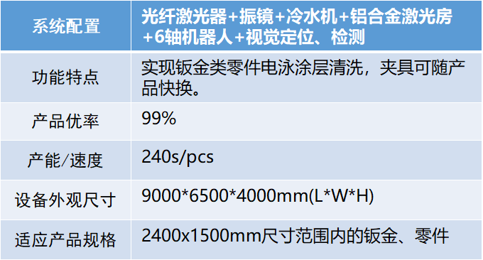 該設備應用於(yu) 新能源電池箱蓋電泳漆塗層的激光清洗,對應108個(ge) 圓孔邊緣直徑10mm範圍的漆層。清洗塗層厚度保證在0.035mm,使用振鏡配套高精度機器人加激光測距儀(yi) 控製清洗焦距。實現100%優(you) 率保證清洗的精度,且不損傷(shang) 電泳塗層下的鍍鋅層。