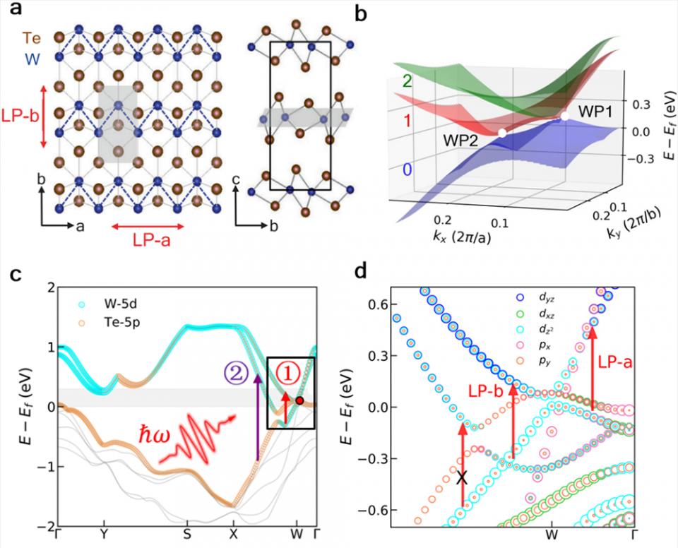 圖2. a. Td-WTe2的原子結構示意圖; b. 費米麵附近的能帶結構。c. 沿著布裏淵區高對稱線分布的能帶結構及原子軌道的相對貢獻。箭頭①及②分別代表靠近或遠離Weyl點的激發; d. 沿著Γ-X方向能帶結構的放大。