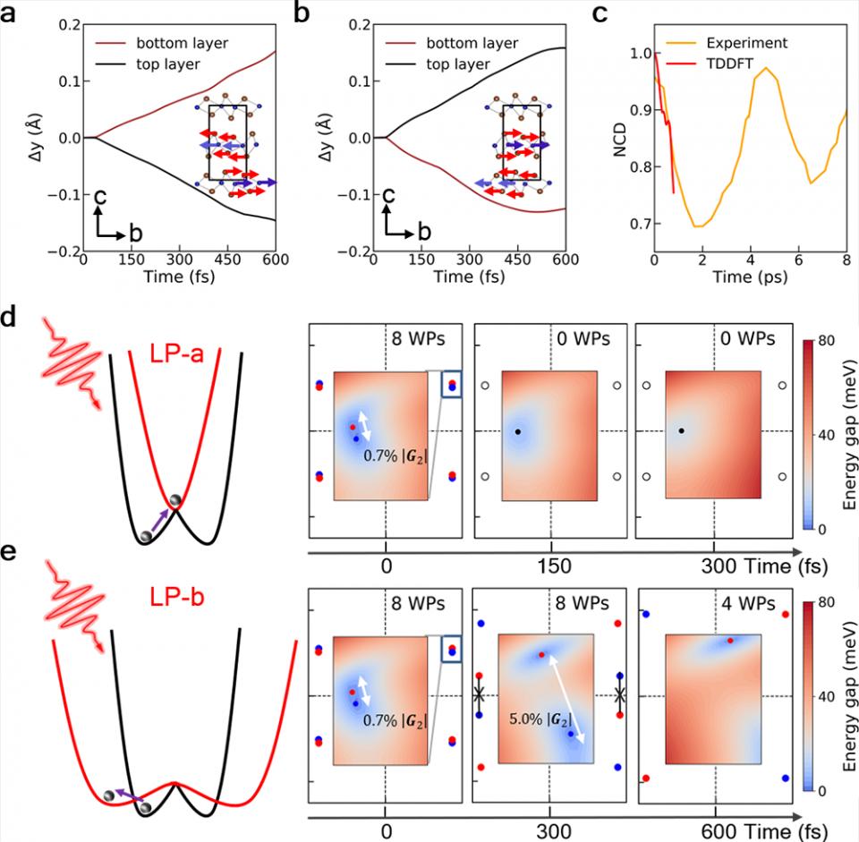 圖3. a-b, 線偏振光極化方向沿著晶體(ti) a軸及b軸的層間相對運動;插圖為(wei) 相應的運動模式。c. 理論模擬與(yu) 實驗觀測的比較。d-e. 體(ti) 係的對稱性演化及 kz=0 平麵內(nei) 兩(liang) 個(ge) 最鄰近Weyl點的位置、數目及分離程度。