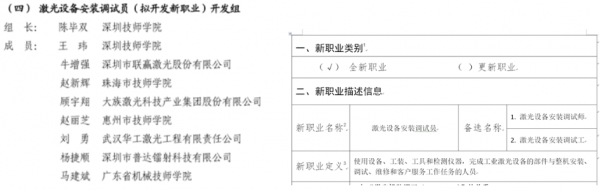 《激光設備安裝調試員》國家新職業(ye) 工種開發小組成立後,在中國光學學會(hui) 激光加工專(zhuan) 業(ye) 委員會(hui) 、激光加工產(chan) 業(ye) 技術創新戰略聯盟、廣東(dong) 省激光行業(ye) 協會(hui) 、中國光穀激光行業(ye) 協會(hui) /湖北省激光學會(hui) 、大族激光科技產(chan) 業(ye) 集團股份有限公司、武漢華工激光工程有限責任公司、