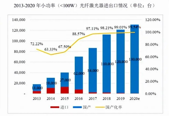 從(cong) 國產(chan) 化替代現狀來看,不同功率激光器的國產(chan) 化率有差異。下圖摘自長光華芯招股書(shu) ,能夠較為(wei) 明顯地看出不同功率之下光纖激光器的國產(chan) 化替代情況。2019年,小功率光纖激光器的國產(chan) 化率就已經逾99%,幾乎實現全覆蓋。而同年中功率及高功率光纖激光器的國產(chan) 化率都在56%左右,國產(chan) 化替代市場仍舊有一定空間。