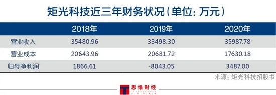 矩光科技財報顯示,近三年公司營業(ye) 收入、營業(ye) 成本和歸母淨利潤有所波動,2020年歸母淨利潤為(wei) 3487萬(wan) 元,2019年、2018年的歸母淨利潤分別為(wei) -8043.05萬(wan) 元、1866.61萬(wan) 元。