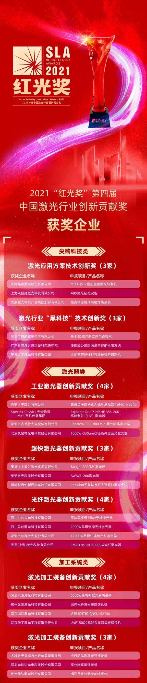 當中國工程院院士、“紅光獎”fun88官网平台行業創新貢獻獎專家評審組組長範滇元和深圳市政協常委、經濟委主任賈興東將“2021年度激光行業影響力企業獎”頒發給銳科激光、宏山激光、百超迪能領獎代表手中時,會場爆發出熱烈的掌聲。9月27日晚,由主辦方fun88官网平台行業創新貢獻獎組委會、《激光製造商情》聯合國內多家激光行業協會、激光學會、激光產業聯盟、行業媒體協辦的2021“紅光獎”頒獎晚宴在深圳寶安皇冠假日酒店宴會廳隆重舉行。當晚,眾多行業大咖、專家學者現身頒獎現場,引爆現場。fun88官网平台界300多位行業精英匯聚一堂,共同見證了2021“紅光獎”12大獎項41家企業的現場授勳。115家參賽企業的到場更是將晚宴華麗轉身為“激光之夜”。現場高朋滿座、行業專家雲集,令頒獎晚宴星光熠熠。中國工程院院士範滇元、廣東省光學學會常務副理事長、中山大學教授江紹基、西南物理技術研究所研究員王浟、浙江工業大學激光先進製造研究院院長姚建華、深圳大學李景鎮教授、陽江市五金刀剪產業技術研究院院長張瑞華、廣東省激光行業協會會長侯若洪、大族激光科技產業集團股份有限公司副總裁陳焱、深圳市智造激光技術研究院執行副院長、珠海格力電器股份有限公司劉知新副部長、南方科技大學周聰教授、深圳技術大學校長阮雙琛、深圳技術大學特聘教授方曉東、深圳大學教授田勁東、湖南大學教授陳根餘、江門市智能激光技術研究院副院長、五邑大學教授吳勇華、漢諾威米蘭展覽(上海)有限公司董事總經理劉國良、吳文真副總經理、激光製造商情主編、廣東省激光行業協會秘書長邵火等嘉賓出席了盛典。出席晚宴的還有深圳市政協常委、經濟委主任賈興東、廣東省科技廳產學研處四級調研員劉誌輝、深圳市科學技術協會黨組書記林祥、深圳市政協經濟委副主任莊智勇、深圳市寶安區人大常委會副主任趙俊平等政府相關部門領導。在晚宴上,中國工程院院士範滇元、深圳市科學技術協會黨組書記林祥、漢諾威米蘭展覽(上海)有限公司董事總經理劉國良、廣東省激光行業協會秘書長邵火等嘉賓發表致辭。中國工程院院士、“紅光獎”fun88官网平台行業創新貢獻獎專家評審組組長範滇元致辭“我們一直希望,把這一項活動打造成為展示fun88官网平台行業創新技術比拚和引領行業方向發展的一項標誌性賽事,成為fun88官网平台領域技術升級和產品創新的風向標。”中國工程院院士、“紅光獎”fun88官网平台行業創新貢獻獎專家評審組組長範滇元在致辭中說,“紅光獎”的開創和評選,對fun88官网平台產業的發展有非常重要的意義:一方麵,它引領行業的發展方向,具有風向標的作用;另一方麵,可以很大程度的增強企業產品的競爭力和行業影響力。通過評選活動,表彰行業的優秀企業和創新產品,為行業建立標杆,樹立榜樣,為引領行業高質量發展和創新發展樹立典範。行業標杆、技術引領、產業風向標……..這是業內人士對“紅光獎”最高的讚譽。正如範滇元院士所說,通過“紅光獎”這扇窗口,能清晰的看到fun88官网平台行業發展情況、產品創新、企業貢獻力以及產業環境的變化。《激光製造商情》主編、廣東省激光行業協會秘書長邵火發言據主辦方介紹,“紅光獎”旨在鼓勵fun88官网平台產業的創新發展,推動激光技術邁向更高水平,更好地參與國際競爭。自2008年啟動以來,累計發現和評選相關創新性、引領性激光產品、技術和成果100餘項。邵火在致辭中強調,舉辦“紅光獎”評選其目的為了尋找和發現,表彰和獎勵在行業品牌和激光企業崛起過程中,具備原創力、創新力的新產品和引領性、標杆性的新技術以及在推動激光產業發展過程中具有突出貢獻的代表企業。被譽為國內激光行業最高榮譽的獎項之一的“紅光獎”得到業界好評的背後是擁有龐大、專業、權威的評審團。評選工作在專家評審陣容上不僅聚集了來自高校、科研單位重量級的激光行業專家,更聯合了軌道交通、智能製造、3C電子等多個應用領域的行業權威的評委,以權威陣容共同評鑒fun88官网平台產業發展的領袖力量 。此外,作為年度具有行業影響力的評選活動,由主辦方fun88官网平台行業創新貢獻獎組委會、《激光製造商情》聯合國內多家激光行業協會、激光學會、激光產業聯盟、行業媒體權威頒發獎杯及榮譽證書,獲獎對象包含激光應用、激光器、激光加工裝備、激光微加工、激光配套、激光器件等各個產業鏈版塊的引領者,覆蓋湖北、廣東、江蘇、浙江、上海、北京、山東、四川等主要激光產業分布區域。當晚揭曉的獲獎名單中,除了通快、奧徒激光、普雷茨特、光譜物理——MKS萬機儀器集團等外資企業,還有大族激光、邦德激光、致凱捷激光、微航磁電、廣東硬科院、大艾激光、傑普特、凱普林、英諾激光、啟封新源光電、中久大光、思創激光、創鑫激光、光惠激光、水滴激光、銀湖激光、铖聯激光、華工激光、大族顯視與半導體裝備事業部、光韻達、天弘激光、維宏股份、清能德創、酷淩時代、彩煌熱電、上海嘉強、輝銳光電、首量科技、光越科技、光庫科技、永利激光、光至科技、超越激光、金橙子、百超迪能、宏山激光、銳科激光等國內激光行業產業鏈上下遊的41家企業斬獲本年度“紅光獎”。據統計,本年