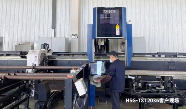 2021年10月,首台HSG-TX12036“3+1雙生卡盤”重載型激光切管機在河北某礦山設備規模企業(ye) 現場完成調試,正式投入生產(chan) ,用於(yu) 礦山輸送設備12米長重型管材的加工。