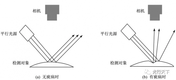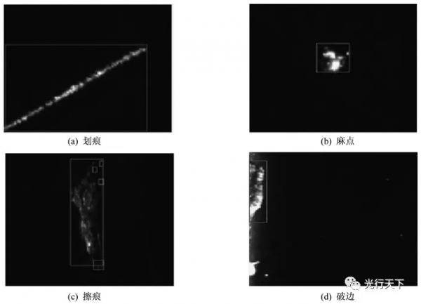 隨著現代工業(ye) 的快速發展, 精密光學元件在各個(ge) 工業(ye) 領域有著廣泛的應用, 光學元件作為(wei) 實現光學功能的載體(ti) , 為(wei) 各類光學儀(yi) 器的開發使用起到了至關(guan) 重要的作用。所以, 鑒於(yu) 光學元件表麵具有的散射特性, 如何更好地對元件表麵缺陷進行檢測也隨之被提出來。光學元件的檢測過程十分繁瑣並且充滿著不確定性, 光學元件按組成材料可分為(wei) 普通光學玻璃、釹玻璃、熔融石英光學玻璃、氟化鈣(CaF2)等一係列材料; 按光學元件口徑可有大到幾米也有小到一二毫米的, 差別可達到數千倍; 按光學元件外形的不同可分為(wei) 平板、非球麵靶鏡、球麵透鏡、柱麵透鏡、角錐棱鏡、偏光鏡、玻璃球等。為(wei) 了適用於(yu) 以上三個(ge) 方麵的各種光學元件的需求, 測量儀(yi) 器、環境、設備、技術必定是各式各樣的。麵對如此種類繁多、功能和外形各不相同的光學元件, 需要我們(men) 去探索相應的檢測技術。因此, 本文主要從(cong) 光學元件表麵缺陷、表麵散射特性, 以及目前國內(nei) 外各種研究方法等方麵, 對光學元件表麵疵病檢測的相關(guan) 研究進行綜述, 並探討利用機器視覺的缺陷檢測技術及未來的發展趨勢。光學元件表麵麵形誤差和表麵粗糙度的檢測是光學檢測技術研究領域的重點, 由於(yu) 光學元件表麵質量的好壞直接影響整個(ge) 光學係統的性能, 所以想要使光學儀(yi) 器設備能更高效地工作, 不僅(jin) 在加工時需要注意光學元件的表麵質量, 而且對成品元件的檢測工作也不能忽視。因此, 光學元件表麵缺陷檢測將成為(wei) 一項重要而持久的研究課題。所謂的光學元件表麵缺陷, 主要是指表麵疵病和表麵汙染物。表麵疵病是指拋光加工後的光學元件表麵依然存在的麻點、劃痕、開口氣泡、破邊、破點等各種加工缺陷, 產(chan) 生的原因主要是加工過程或後續的不當操作。圖1所示為(wei) 四種疵病的大致形狀。劃痕指光學元件表麵長條形的劃傷(shang) 痕跡。由劃痕長度的不同, 可以分為(wei) 長劃痕和短劃痕, 以2 mm為(wei) 界限, 若劃痕長度大於(yu) 2 mm屬於(yu) 長劃痕, 小於(yu) 2 mm則是短劃痕。對於(yu) 短劃痕, 評價(jia) 標準是其檢測時的累積長度。相對而言, 劃痕較麻點等缺陷更容易檢測出。麻點指光學元件表麵上的陷坑、蝕坑、疵點, 其坑內(nei) 的表麵粗糙度較大, 寬度與(yu) 深度大致相同, 邊緣也不規則。一般情況下, 規定長寬比大於(yu) 4:1的缺陷為(wei) 劃痕, 反之小於(yu) 4:1的缺陷為(wei) 麻點。氣泡是由光學元件的生產(chan) 或加工過程中未及時排除的氣體(ti) 所形成的, 由於(yu) 各方向氣體(ti) 的壓力均勻分布, 所以氣泡的形狀一般呈圓球形。破邊是指出現在光學元件邊緣的疵病, 雖然處於(yu) 光源有效區域之外, 但是也屬於(yu) 光的散射源, 對光學性能也會(hui) 產(chan) 生一定的影響, 所以也屬於(yu) 疵病範疇。表麵疵病作為(wei) 一種加工過程中人為(wei) 造成的微觀局部缺陷, 對光學元件的表麵性能有著一定的影響, 從(cong) 而有可能造成光學儀(yi) 器運行錯誤等嚴(yan) 重的後果。總之, 光學元件的表麵疵病會(hui) 對光學係統性能產(chan) 生危害, 其根本原因在於(yu) 光的散射特性。光學元件表麵缺陷對於(yu) 自身以及整個(ge) 光學係統的危害表現在以下幾個(ge) 方麵:(1) 光束的質量下降。元件表麵缺陷處會(hui) 產(chan) 生光的散射效應, 使得光束在通過缺陷後能量被大量消耗, 從(cong) 而降低了光束的質量。(2) 缺陷的熱效應現象。由於(yu) 表麵缺陷所處區域比其他區域容易吸收更多的能量, 產(chan) 生的熱效應現象可能會(hui) 使元件疵病發生局部變形、破壞膜層等, 進而危害整個(ge) 光學係統。(3) 損壞所處係統中其他光學元件。激光係統中, 在高能激光束的照射下, 元件表麵疵病產(chan) 生的散射光會(hui) 被係統內(nei) 的其他光學元件吸收, 從(cong) 而造成元件的受光不均勻, 當達到光學元件材料的損傷(shang) 閥值時, 會(hui) 使傳(chuan) 播光線的質量受到影響, 光學元件損壞, 更有可能造成光學係統被嚴(yan) 重的破壞。(4) 疵病會(hui) 影響視場清潔。當光學元件上有過多的疵病時, 會(hui) 影響微觀的美觀度, 另外, 疵病還會(hui) 殘留微小的灰塵、微生物、拋光粉等雜質, 這將造成元件被腐蝕、生黴、生霧, 會(hui) 明顯影響元件的基本性能。光學元件表麵的散射特性是缺陷產(chan) 生危害的根本原因。當光束照射到有疵病的光學元件表麵時, 由於(yu) 疵病位置的反射麵並不是一個(ge) 光滑麵, 這些離散無規則的局部缺陷使部分入射光發生了偏轉, 遠離了預定方向, 變成了偏離主光束的雜質光。並且, 這些雜質光會(hui) 產(chan) 生多次反射透射, 所產(chan) 生不規則的散射光會(hui) 對不同光學儀(yi) 器造成不同程度的影響。在光學係統中, 影響其性能的主要原因是由係統內(nei) 部產(chan) 生的大量散射光造成的, 而產(chan) 生這些散射光的根本原因, 又在於(yu) 光學元件自身的質量, 即使整個(ge) 光學係統設計得再好, 如果內(nei) 部光學元件的質量不過關(guan) , 那麽(me) 構成的係統也不能正常工作。因此需要提高光學元件本身的質量來改善散射光所帶來的問題。雖然光學係統的窗口或係統內(nei) 部也可能會(hui) 產(chan) 生散射光, 但這種散射光能量較小, 大部分的散射光是由光學元件表麵散射造成的。通常表