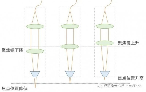 一般大家采用最簡單的做法就是隻通過改變切割頭的高度位置來獲得理想的焦點位置,比如將切割頭整體(ti) 下降,焦點位置就降低,將切割頭整體(ti) 上升,焦點位置就升高,如下圖所示。