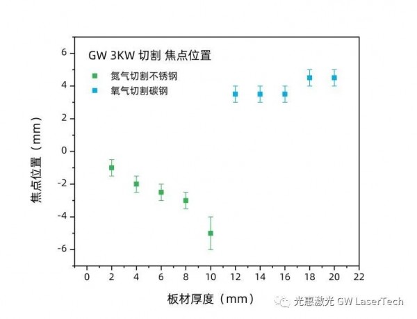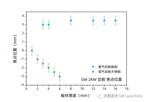 焦點位置的高低是相對零焦而言的,因此在調焦之前,首先要確定零焦的位置,然後向上/向下移動聚焦鏡一定距離,進而調節焦點位置的升高/降低值。通過之前的分析可知,在零焦的位置,光斑最小,也即切縫最小。上下移動焦點位置,都會(hui) 使光斑變粗,導致切縫線性變寬、切麵質量不高。