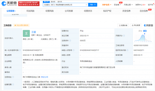 天眼查顯示,2月11日大族激光(荊門)新能源裝備科技有限公司成立,法定代表人為(wei) 王瑾,注冊(ce) 資本5000萬(wan) 元。據了解,新公司經營範圍包含:人工智能應用軟件開發;智能機器...