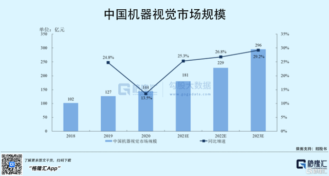 如今,中國市場已成為(wei) 全球機器視覺市場規模增長最快的市場之一。得益於(yu) 宏觀經濟回暖、新基建投資增加、數據中心建設加速、製造業(ye) 自動化推進等因素,預計 2020 年至 2023 年,中國機器視覺行業(ye) 的銷售額將以 27.15%的複合增長率增長,2023年銷售額將達296億(yi) 元。