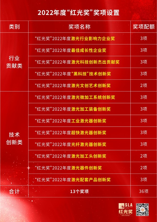 評選結果將在2022“紅光獎”頒獎晚宴現場公布。屆時,合作夥(huo) 伴、評審專(zhuan) 家,以及獲獎單位及目標客戶高層,逾200多家激光企業(ye) 的創始人、業(ye) 界知名激光人士、行業(ye) 精英將匯聚一堂,共襄盛舉(ju) ,共同見證“紅光獎”盛況。隻要您有創新的產(chan) 品和硬核的技術,都有機會(hui) 在“紅光獎”的舞台上,向行業(ye) 和大眾(zhong) 展示自己。