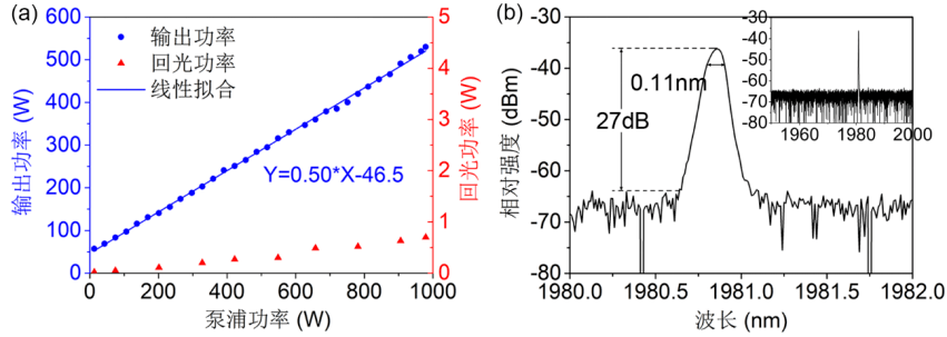 如下所示,圖4(a)所示是摻銩光纖放大器輸出功率及端口1處測得的回光功率隨泵浦功率的變化關(guan) 係圖,輸出激光功率呈線性增加,整個(ge) 過程沒有觀察到功率下降現象,泵浦功率為(wei) 979 W時,摻銩光纖放大器輸出功率達到530 W,對應的斜率效率為(wei) 50%,。在輸出功率為(wei) 500 W時測得的光譜圖4(b)所示,輸出激光信噪比為(wei) 27 dB。掃描了1950~2000 nm範圍內(nei) 的激光光譜,沒有觀察到明顯的自發輻射和非線性效應,如4(b)內(nei) 嵌圖所示,說明輸出激光功率僅(jin) 受限於(yu) 泵浦功率。該結果為(wei) 目前國內(nei) 2 µm波段光纖激光器實現的最高輸出功率,同時也驗證了國產(chan) 摻銩石英光纖在高功率係統中的可靠性。