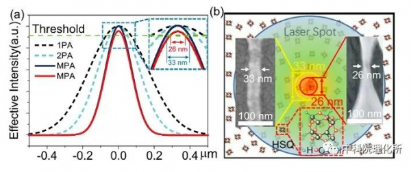 HSQ是一種無機光刻膠,作為(wei) 典型的電子束光刻膠被廣泛應用於(yu) 微納器件的圖形化。由於(yu) 其本征吸收波長短(<200 nm),僅(jin) 有使用真空紫外157 nm波長實現HSQ光學光刻的報道,傳(chuan) 統的深紫外(193 nm)光刻以及可見光波長的激光3D打印技術難以對其進行微結構加工。研究人員利用飛秒激光與(yu) 物質的非線性相互作用,通過多光子吸收引起的“雪崩電離”效應,實現了HSQ的飛秒激光超衍射納米光刻,突破了前人提出的HSQ無法使用可見和近紅外光進行光刻微加工的局限。首先,通過精確控製激光焦點處的光場分布,研究了閾值效應對飛秒激光超衍射納米光刻技術加工的HSQ微結構特征尺寸的影響規律。隨著HSQ同時吸收光子數的增加,有效光強分布曲線變得越來越窄,同時越來越陡峭。當飛秒激光的能量逐漸逼近閾值能量時,會(hui) 得到具有極小特征尺寸的HSQ結構。研究人員係統地研究了激光能量、掃描速度和掃描方式等加工參數對特征尺寸的影響規律,通過精細調節激光的加工參數,成功得到了自支撐的33 nm 和26 nm HSQ納米結構,實現了λ/30的特征尺寸,為(wei) 基於(yu) HSQ微結構的新型無機納米器件的研究奠定了堅實的基礎。