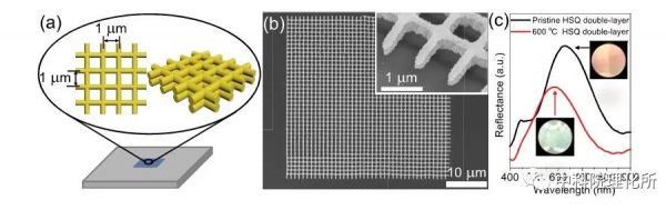研究人員還利用該技術構築了HSQ仿生結構色和光學微器件菲涅爾透鏡。模仿自然界蝴蝶翅膀的多層堆疊結構製備了“HSQ-空氣-HSQ”的周期性3D堆疊結構,該結構在可見光範圍內(nei) 具有明顯的結構色。經過600℃的加熱處理,該結構色並沒有消失,而是發生了顏色的藍移,展示出了優(you) 異的耐熱性。
