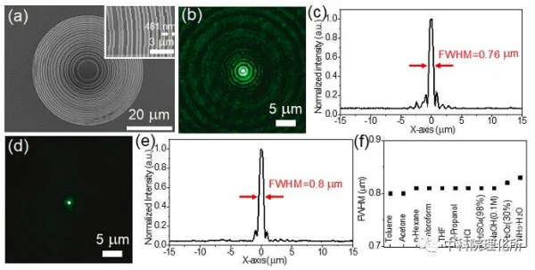 針對基於(yu) HSQ同心圓環的微型菲涅爾透鏡,在對532 nm激光束進行聚焦時,得到了半峰寬僅(jin) 為(wei) 0.76 μm的聚焦光斑,展示出優(you) 異的光束聚焦能力。將上述HSQ微型菲涅爾透鏡加熱到400 ℃,其聚焦能力沒有發生明顯變化,聚焦光斑的半峰寬僅(jin) 僅(jin) 增加到0.8 μm,表明該微型菲涅爾透鏡具有良好的耐熱性能。進一步將熱處理的HSQ微型菲涅爾透鏡浸泡在常見的化學試劑中,發現微型菲涅爾透鏡經化學溶劑處理後聚焦性能沒有明顯變化,甚至對98%的濃硫酸也展示出良好的耐受性。HSQ微結構所表現出優(you) 異的耐熱性和耐溶劑性,為(wei) 飛秒激光直寫(xie) 適用於(yu) 嚴(yan) 苛環境的無機微納結構和功能器件奠定了堅實的基礎。