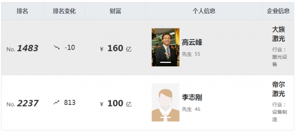 大族激光高雲(yun) 峰為(wei) 胡潤全球富豪榜的常客,已連續多年榮登激光行業(ye) 富豪榜首。榜單顯示,大族激光高雲(yun) 峰雖然排名較去年下跌10位,但財富值淨增5億(yi) 元,從(cong) 去年的155億(yi) 元增長至今年的160億(yi) 元,仍穩居行業(ye) 榜首。